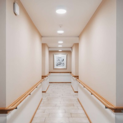 Ein moderner Neubau in ruhiger, grüner Lage mit guter Verkehrsanbindung. Auf Atmosphäre und Funktion wurde gleichermaßen großer wert gelegt: Sanfte Farbtöne und hochwertige Materialien schaffen Behaglichkeit, während Barrierefreiheit, umlaufende Handläufe oder eine besondere Lüftungsanlage für einen angenehmen Alltag und hohe Funktionalität bei der Pflege sorgen.